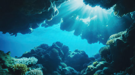 Sunlight penetrates the ocean depths illuminating a vibrant coral reef ecosystem with diverse formations and clear blue water creating a serene and breathtaking underwater scene