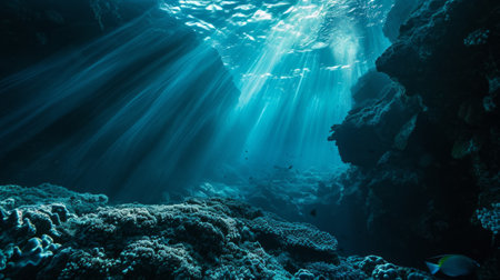 Experience the serene beauty of an underwater coral reef, showcasing vibrant marine life illuminated by captivating sunlight rays. Discover nature