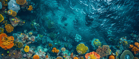Vibrant Coral Reef Stunning underwater scene capturing a healthy coral reef ecosystem teeming with colorful marine life. Schools of tropical