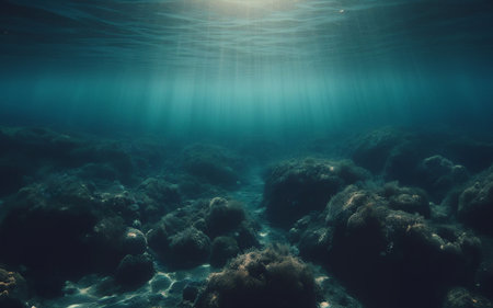 A mesmerizing underwater scene showcasing gentle light rays piercing through ocean depths, illuminating marine life and a rocky seabed filled with vibrant textures.