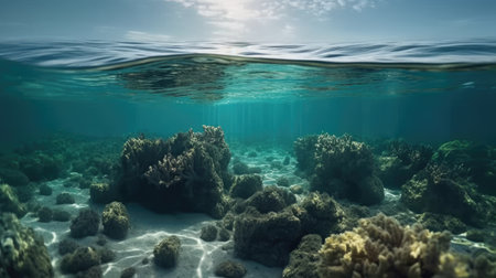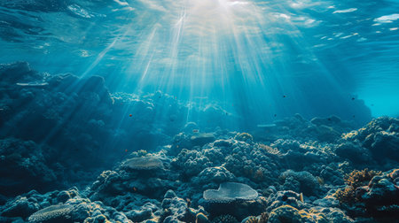 A serene underwater landscape showcasing vibrant coral formations, with sunbeams piercing through the clear ocean depths.
