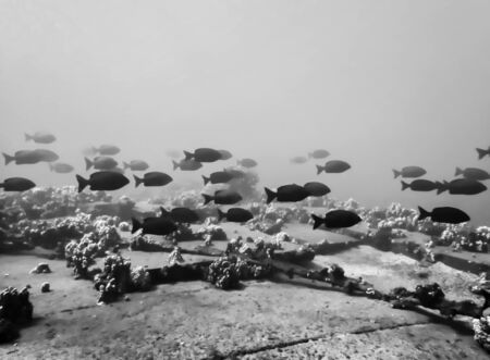 Monochromatic image with black tropical fish in silhouette swimming over coral.