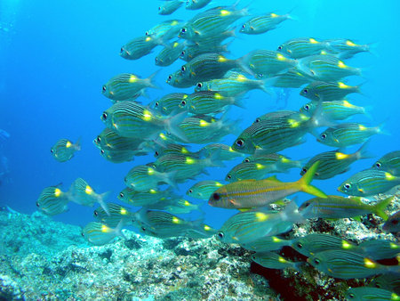 The bluestripe snapper, Lutjanus kasmira, (also known as the bluestripe sea perch) is a common species of marine fish of the snapper family Lutjanidae. They are shoaling and schooling (all swimming in the same direction in a coordinated way.)