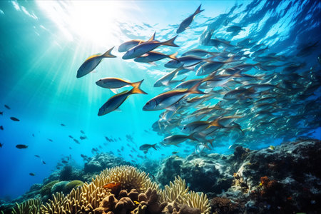 A mesmerizing underwater scene featuring a school of fish swimming gracefully in the ocean depths. Rays of sunlight penetrate the water's surface, creating a tranquil atmosphere. This captivating image showcases the beauty of marine life and the serene underwater environment.