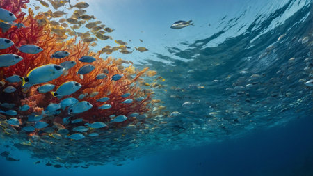 A group of sea fish swimming together near a colorful coral garden, creating a dynamic and engaging underwater scene