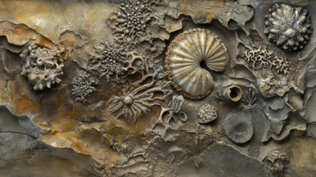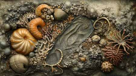 Explore a captivating representation of fossilized sea life embedded in a rocky surface, featuring shells, coral, and vibrant marine details, evoking the beauty of ancient ocean ecosystems.