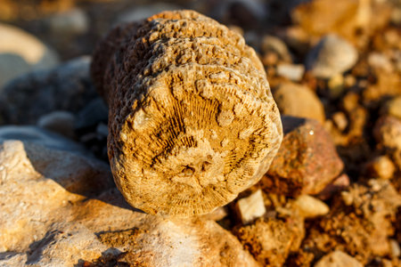 Close-up macro shot of a fossilized Rugosa coral specimen with detailed internal structures resting on rocky ground in warm sunlight