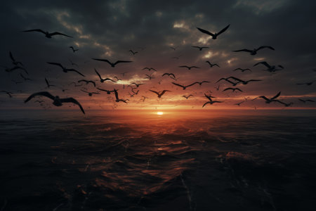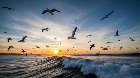 A flock of birds gracefully flies over a calm ocean, reflecting the soft glow of the sun during the golden hour, creating a peaceful coastal ambiance.