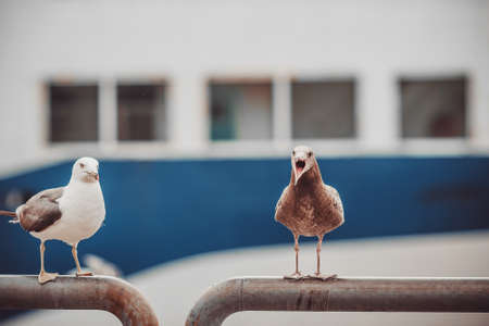 Seagulls near the sea and ship in the natural environment. Competition between gulls for food. Brown gray feathered bird with a yellow beak close-up in the open air.