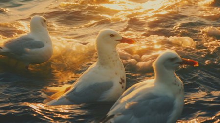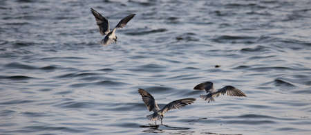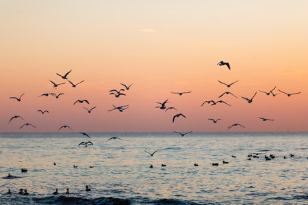 Seagulls flying over the sea at sunset. Beautiful seascape.