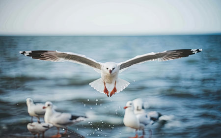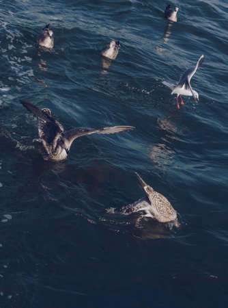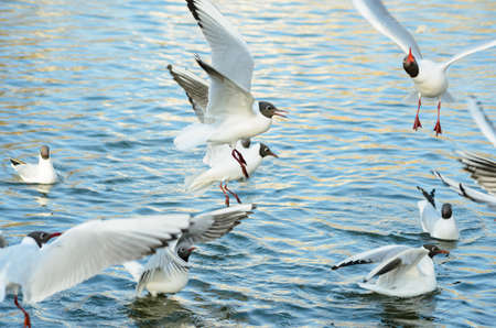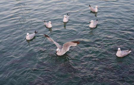 Seagull ready for takeoff from the sea. More seagulls around it waiting for fish