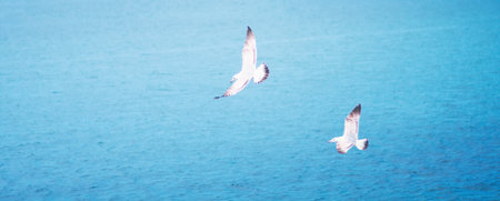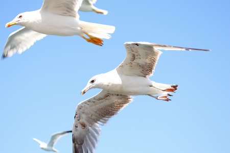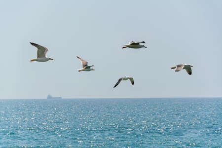Seagulls are flying above the sea, the sky is blue and cloudless . Single seagull flying with with sea as a background