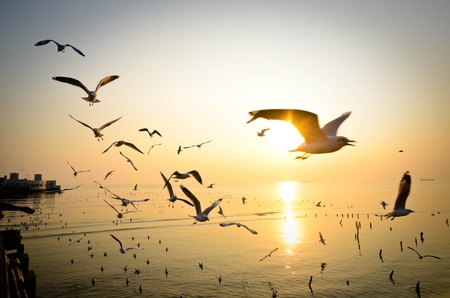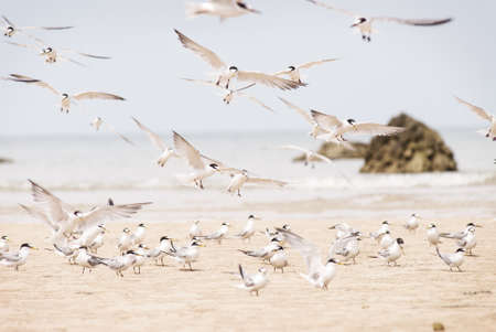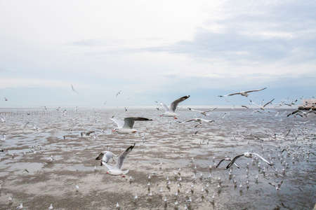 A flock of seagulls on the coast at Samut Prakan Province in Thailand.