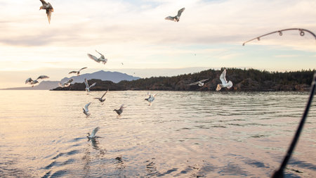 A sailboat with a fishing rod behind trolls for fish, but has a flock of seagulls chasing it instead along British-Columbia's Sunshine Coast