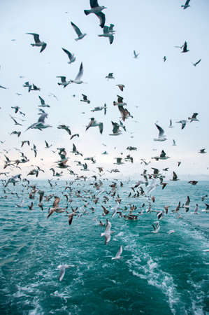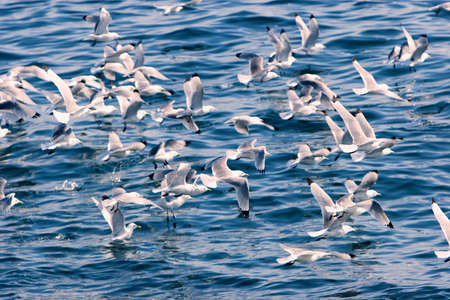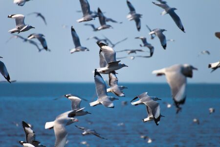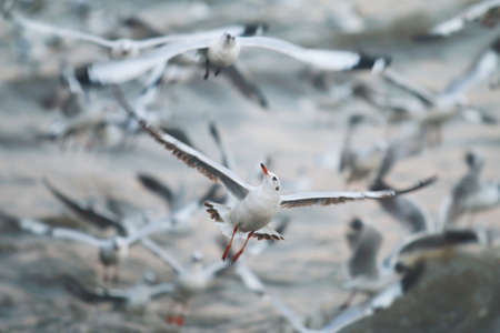 Large group flock of seagulls on sea lake water and flying in sky on summer, focus selective