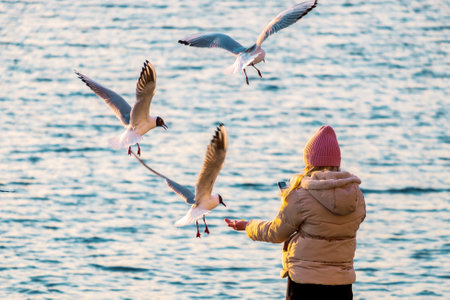 Minsk, Belarus - March 24, 2022: A girl feeds seagulls with her hand on the river bank and takes it on her smartphone