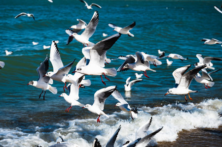 Seagulls soar gracefully above the Caspian Sea at Makhachkala, captured in mid-flight against the vibrant blue waves. The image exudes a sense of freedom and coastal beauty.
