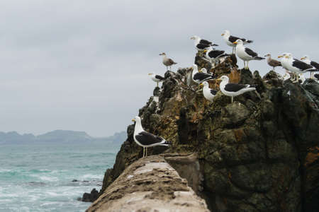 Seagulls in a rock in the coast of Chile. Pacific Ocean