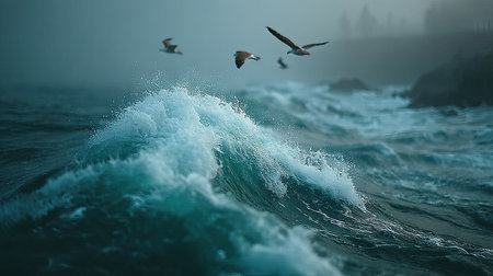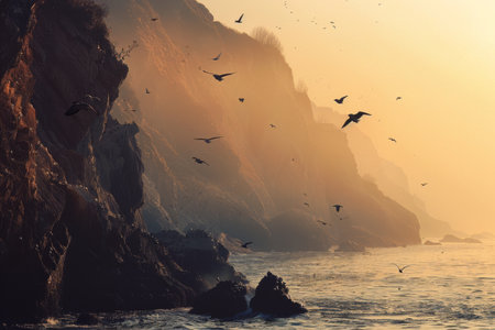 A dramatic scene of birds flying over misty coastal cliffs at sunset, creating an ethereal and powerful atmosphere.