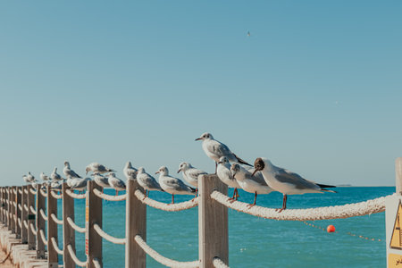 Seagulls perched along a rope barrier by the sea on a sunny day