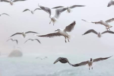 A tranquil scene of a foggy coastline where numerous birds soar above rocky outcrops, capturing the serene beauty of nature's coastal landscape.
