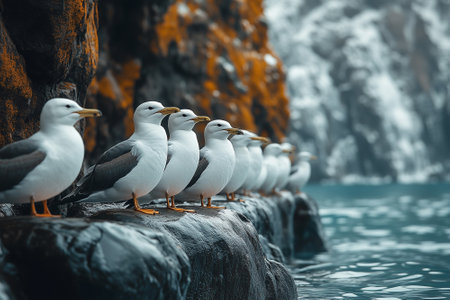 Seagulls on the rocks by the sea in Homigot beach, Pohang, South Korea.