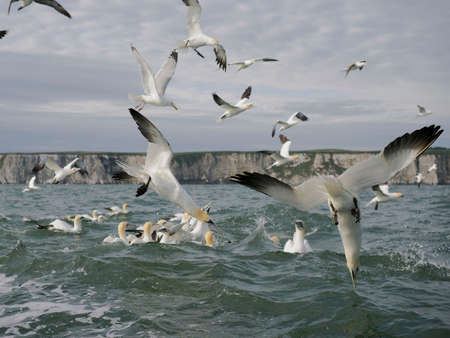 Gannet, Morus bassanus, group of bird diving into water, Yorkshire, June 2022