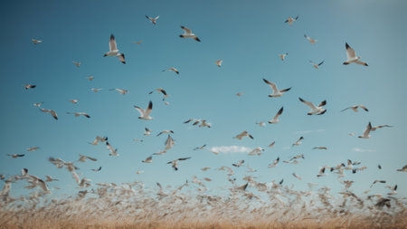 Ethereal Moments: Capturing the Majestic Flock of Birds Soaring Over the Serene Body of Water
