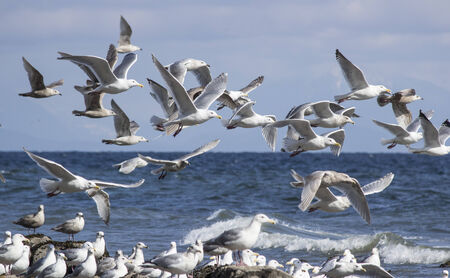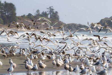 Large colony of sea gulls enjoying a sunny day in Pebble Beach, Crescent City California as they gather along the mouth of Marhoffer creek