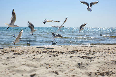 seagulls fly over the sandy coast of the Black Sea on a summer day, Ukraine Kherson region