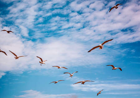 Panorama low angle view group of seagulls soaring flying under sunny cloud blue sky looking to be feed at shoreline of South Padre Island, Texas Gulf Coast, gulls are seabirds of Laridae family. USA