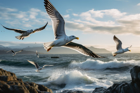 Seagulls flying high over blue water, freedom in nature generated by artificial intelligence