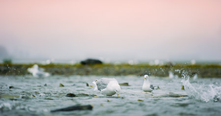 Seagulls shuttle back and forth in the river for food. There's salmon around. Animal food chain as salmon return to freshwater to spawn, Alaska, summer 2017.