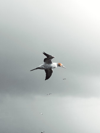 Northern gannet flying over the air currents in Mykines, Faroe Islands