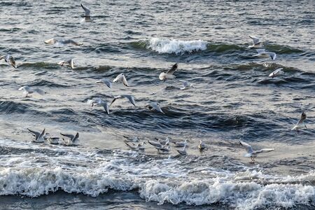 Many seagulls hover in the blue bright sky and deep blue stormy ocean. Skyline background. Beautiful white clouds in the sky. Horizon of the sea