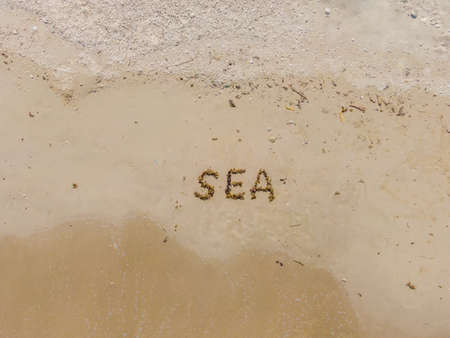 A beach with an inscription in English: sea. The letters are made by seaweed. Sea vacation after coronavirus COVID 19
