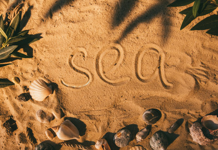 Sand background. Summer vacation. Exotic weekend. Beach resort. Sea finger writing word in frame of seashell stone green leaves nature composition on golden surface.