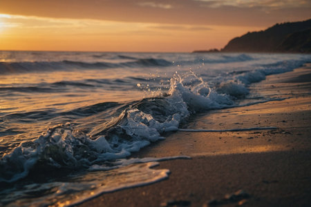 Experience the beauty of gentle ocean waves lapping at the shoreline at sunset, creating a tranquil and serene ambiance perfect for relaxation and escape.