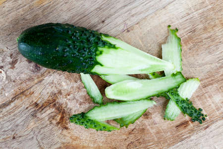 Peeled green ripe cucumber, lying on a wooden table. Photo close-up. One part of the cucumber is purified and is acute