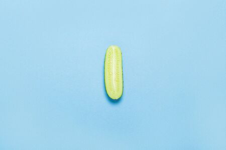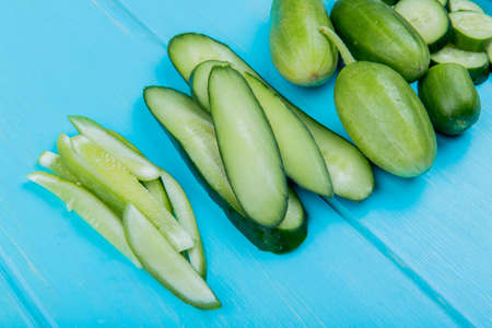 Fresh cucumbers with a fancy shape on a blue background. Top view horizontally with space, sharp light