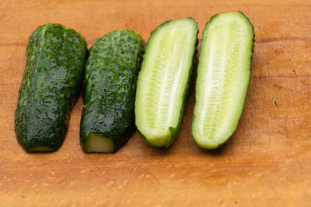 juicy ripe cucumber cut in half lies on a wooden cutting board, top view