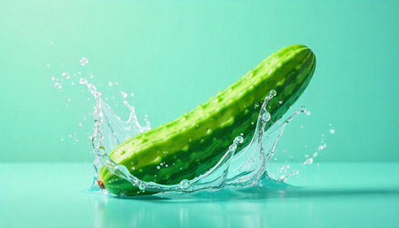 Fresh cucumber splash on vivid turquoise backdrop for healthy food