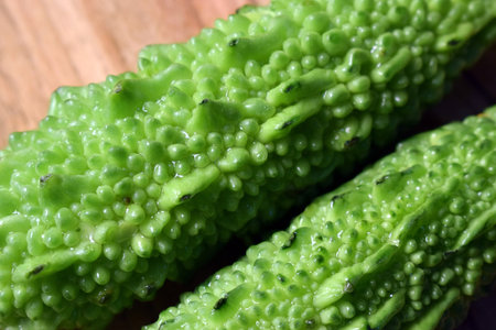 Green Vegetable Bitter Melon Or Bitter Gourd On Wooden Table Image