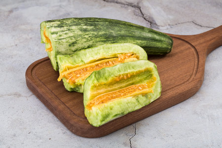 Ripe Indian Cucumber on a concrete background. Kerala orange cucumber for vishu kani vellari. Also called Vellarika in Malayalam.