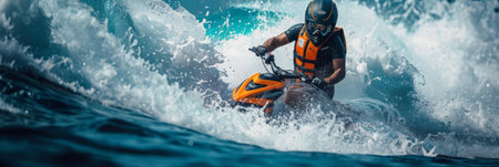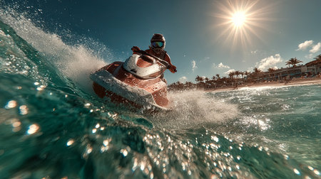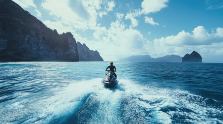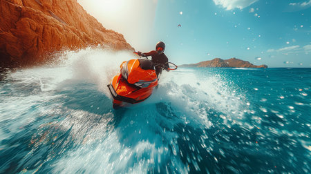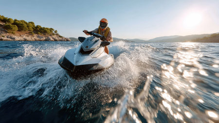 A dynamic scene of a man riding a jet ski across deep blue water, creating splashes under bright sunlight in a scenic coastal area, embodying adventure.