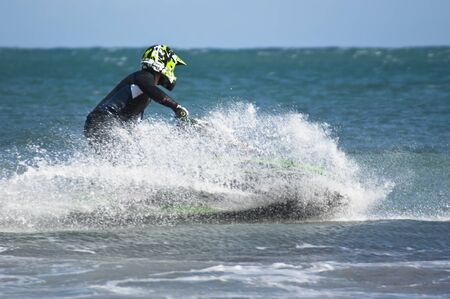 CAMYUVA, KEMER, TURKEY - JULY 16, 2015: Unidentified Turkish man glides over the waves of the Mediterranean Sea on Jet Ski. Extreme water sports are increasingly popular on the beaches of Turkey