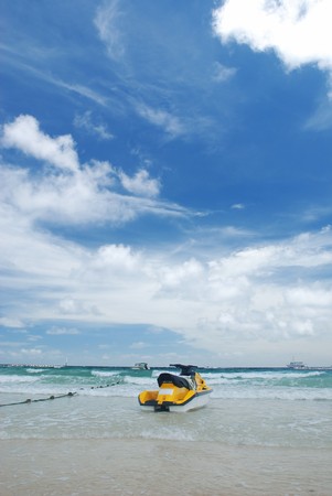 A jet ski beached on a sandy shore, with the ocean in the background and a tropical island in the distance.