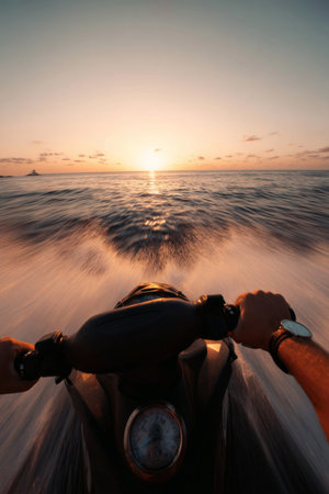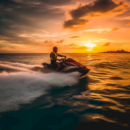 A dynamic scene capturing a rider on a jet ski slicing through the shimmering ocean waves during sunset. Perfect for showcasing adventure and excitement.