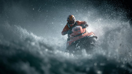 A rider expertly navigates a powerful jet ski through crashing waves, showcasing skill and excitement while enjoying the vibrant ocean on a bright summer day.