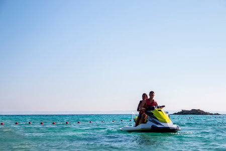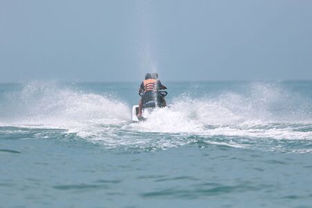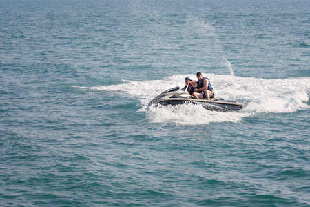 Acre, Israel - 11.05.2018: Sports active rest. Two young men racing on jet ski. Active summer vacation on the Mediterranean sea